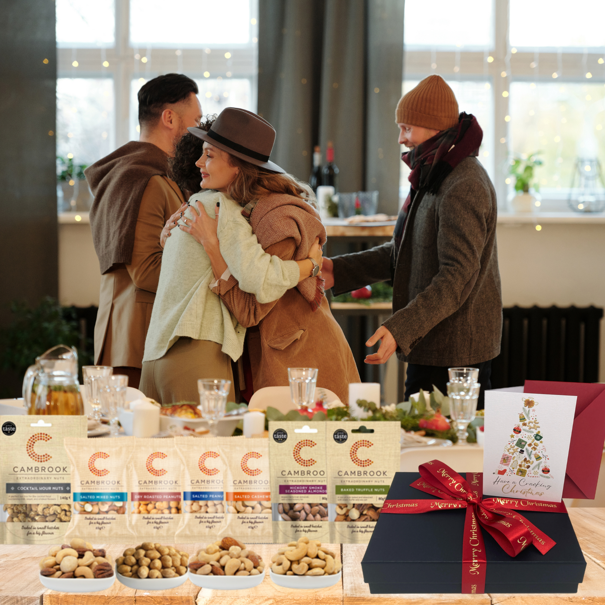 Make this Christmas cracking with a gourmet nut hamper designed to impress. Featuring seven indulgent snack packs from Cambrook, including Truffle Baked Nuts, Hickory Almonds, and a festive Cocktail Hour blend, this luxury gift set is full of festive flavour and premium quality. Beautifully presented in a sleek black gift box with a red satin “Merry Christmas” ribbon and a charming illustrated greeting card, it’s the perfect ready-to-gift treat for friends, family, colleagues – or yourself!